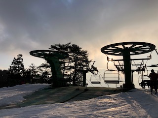 写真は、リフトで上まで上がった時の夕日が