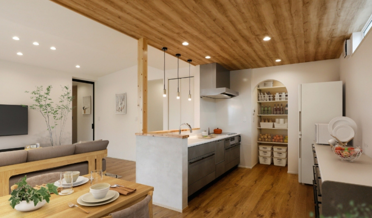 メインの壁紙には白を採用しシンプルなイメージを固定。アクセントとして、ダイニングキッチンの天井部分に木目を広々と使用することで、リラックスしやすい自然のイメージをプラスしました。